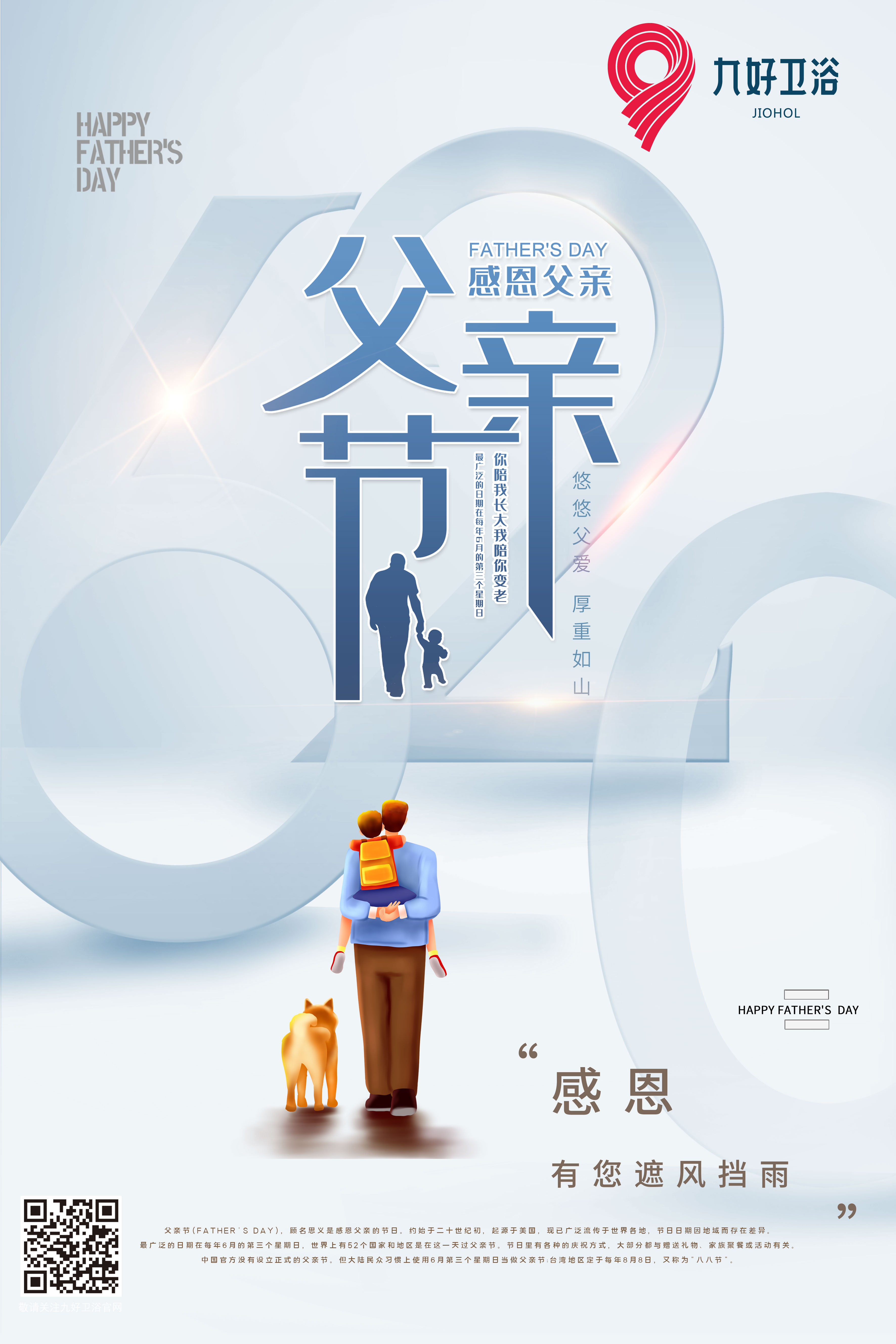 2021年父亲节为6月20日,是一个感恩父亲的节日,虽起源于美国,却流行于全球。这一天,你可以为父亲定制特别的礼物,可以送上鲜花表达敬意,或者寄送贺卡,还可以为父亲定制一款款精致的家居礼物。在这个浓情的父亲节,广东九好卫浴祝愿天下父亲们身体健康!幸福快乐!